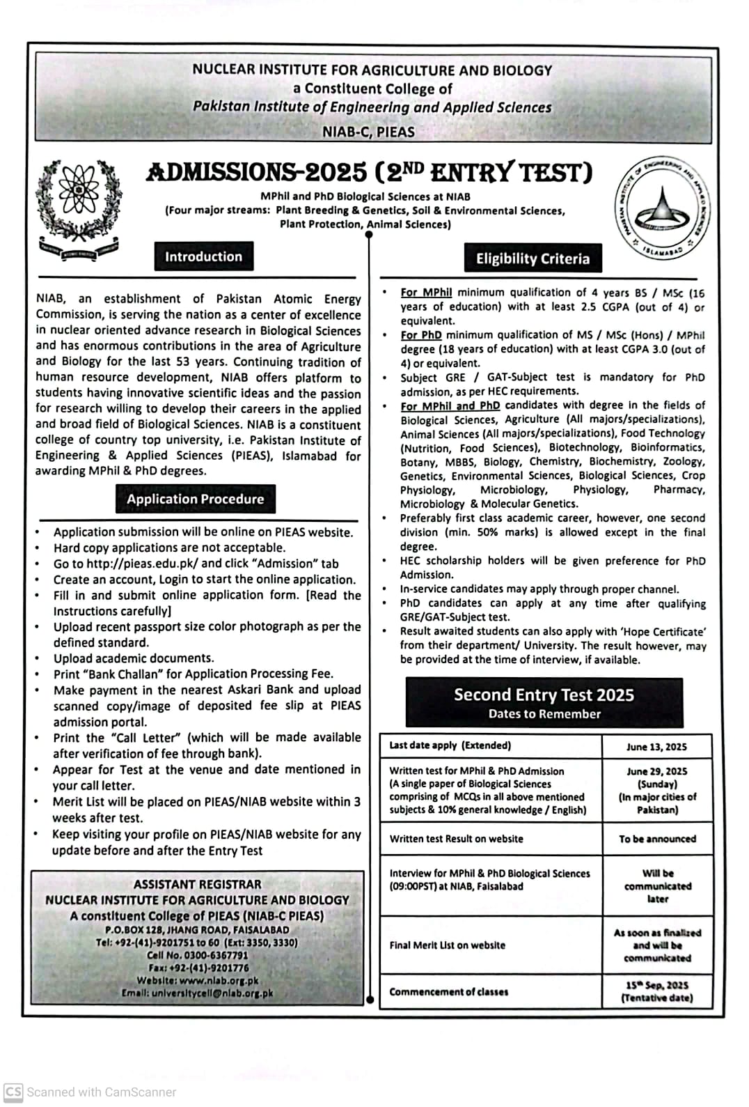 FAQs Apply Online International Students Information Leaflet for MS Programs PIEAS Entry Test Pattern and Syllabus for MS Programs Fee Structure Advertisement Admissions 2026 NIAB-C Advertisement Admissions 2025